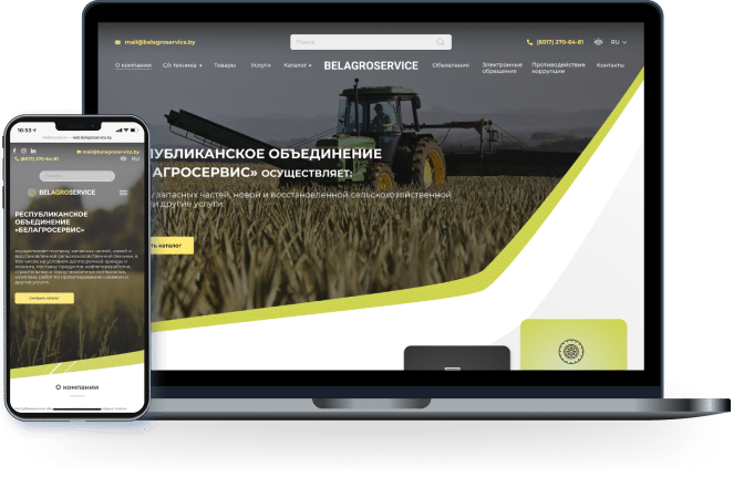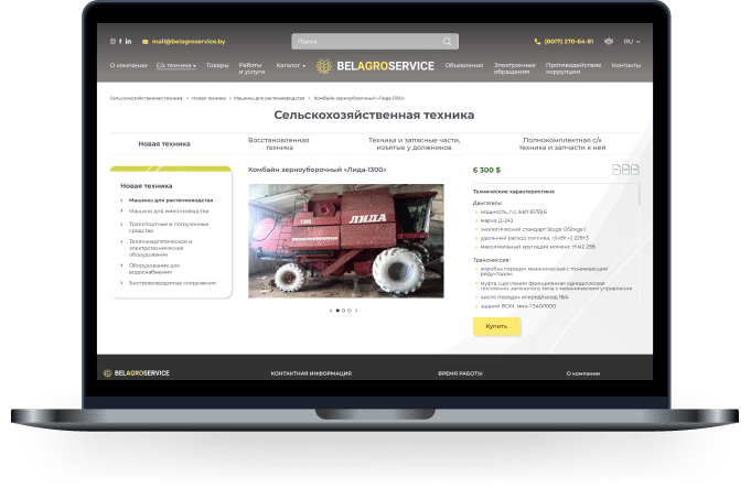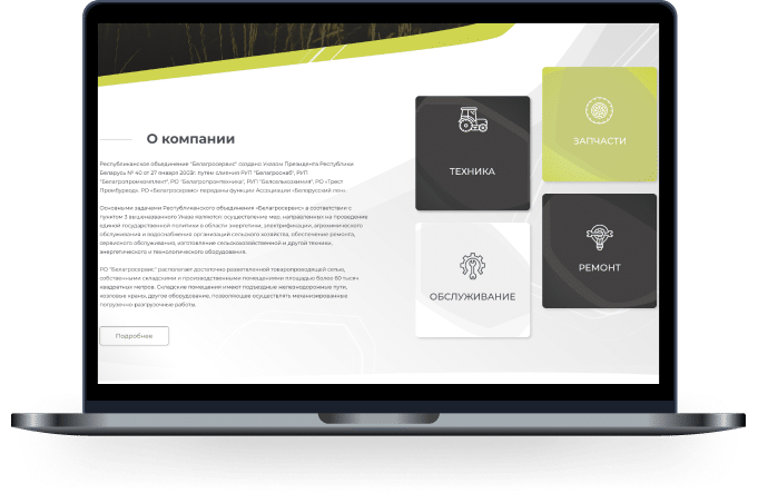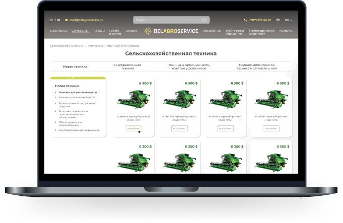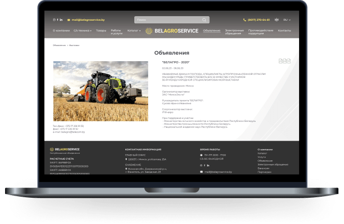 Сorporate website for the national agricultural corporation BelAgroService. The main direction is the sale of agricultural machinery and spare parts for it.